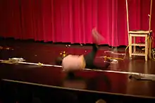 Since 2006, Sola has also collaborated with composer Michael Webster as the duo Shakey's.[10] The performances combine comedy, art historical critique and slapstick silent-movie gestures.[11] They have been presented at art venues such as the Hammer Museum, Los Angeles Contemporary Exhibitions, as well as within self-enclosed installation that invited visitors to put their heads into peep-holes in order to see the show (Shakey’s Mining Adventure, 2007). In 2013, Sola presented Shakey's in 'Der Hintern in Der Luft at 356 Mission in Los Angeles. Dressed as vaudevillian restaurant servers, Sola danced, drew, sculpted, made a sandwich, threw a knife, then a hatchet, then an axe, started and extinguished a fire, culminating in Sola and Webster putting the entire show, including a large Laura Owens painting, through a 1000-pound woodchipper on stage.[10]
