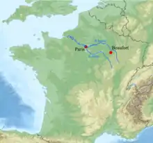 Beaufort's surname (properly de Beaufort, "from Beaufort") probably reflects his birthplace[4] at his father's castle and manor of Beaufort ("beautiful stronghold") in Champagne, France.[5][6] The Portcullis heraldic badge of the Beauforts, now the emblem of the House of Commons, is believed to have been based on that of the castle of Beaufort, now demolished.[7]