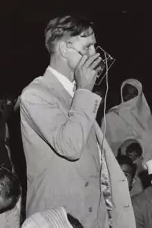 ![]() Bowers speaking into a microphone at a 1954 UNESCO event in Mysore, India | |
