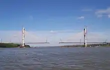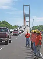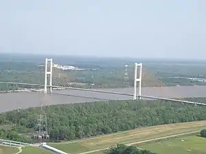The John James Audubon Bridge, completed and opened in May 2011, is a Lower Mississippi River crossing between Pointe Coupee and West Feliciana parishes in south central Louisiana. The bridge has the second longest cable-stayed span (distance between towers) in the Western Hemisphere at 1,583 ft (482 m), after Mexico's Baluarte Bridge with a 1,706 ft (520 m) span, and has a total length of 12,883 ft (3,927 m)nearly three-and-a-half times longer than the Baluarte Bridge's 3,688 ft (1,124 m) total length.[1][6] The Audubon Bridge replaces the ferry between the communities of New Roads and St. Francisville. The bridge also serves as the only bridge structure on the Mississippi River between Natchez, Mississippi and Baton Rouge, Louisiana (approximately 90 river miles). The bridge conveys Louisiana Highway 10, which is in a concurrence there with the Zachary Taylor Parkway.