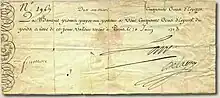 The fractional reserve ratio was one fifth,[25] and a Royal edict to criminalise the sale of gold was decreed.[26] A later Royal edict decreed that gold coin was illegal,[27] which was soon reversed,[28] leading to 50 people being killed in a stampede.[29] The company's shares were ultimately rendered worthless, and initially inflated speculation about their worth led to widespread financial stress, which saw Law dismissed at the end of 1720 from his sinecure as Controller General[4] and his post as Chief Director of the Banque Générale.