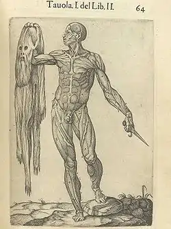 Valverde's most famous work was Historia de la composicion del cuerpo humano, first published in Rome, 1556. All but four of its 42 engraved copperplate illustrations were taken almost directly from Andreas Vesalius's De humani corporis fabrica. Vesalius bitterly commented on Valverde's plagiarism, accusing him of having performed very few dissections himself. Occasionally, however, Valverde corrected Vesalius' images, as in his depictions of the muscles of the eyes, nose, and larynx.[1] One of Valverde's most striking original plates is that of a muscle figure holding his own skin in one hand and a knife in the other, which has been likened to Saint Bartholomew in The Last Judgment (Michelangelo) of the Sistine Chapel.
