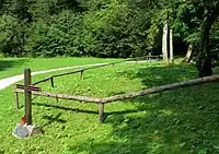Kamniška Bistrica is the site of six known mass graves from the period immediately after the Second World War. All of the graves are located along the road from Stahovica to Kamniška Bistrica. Some of the graves probably contain the remains of a truckload of wounded Croatian soldiers that were transported to the area on 10 May 1945. The Macesnovec Mass Grave (Slovene: Grobišče Macesnovec) lies a few dozen meters east of a tourism sign. It was a clearly visible mound containing the remains of many prisoners of war, primarily Croatians but also Slovenes.[4][5][6] The Šimen Slide Mass Grave (Grobišče Šimnov plaz) lies above the road and is a clearly visible mound along a path. It contains the remains of many Croatian refugees.[7] The King's Hill Mass Grave (Grobišče Kraljev hrib) is located a few dozen meters from garages at the bottom of the cableway to the Big Pasture Plateau, in a clearing below the electric lines by the pole marked Č 23. It contains the remains of many Croatian refugees.[8] The Kopišča 1 and 2 mass graves (Grobišče Kopišča 1, 2) are raised mounds. The first, larger mound (6 by 15.5 meters or 20 by 51 feet) lies immediately behind a memorial site. The smaller mound measures 6 by 8 meters (20 ft × 26 ft). They contain the remains of many prisoners of war, mostly Croatians and Serbs,[9][10] and a large memorial has been set up.[5] The Dolski Plac Mass Grave (Grobišče Dolski plac) is a large mound in the middle of a spruce plantation. It is marked by a decaying wooden cross. It contains the remains of a large number of mostly Croatian refugees.[11]