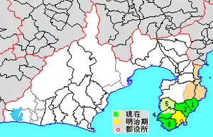 In a round of consolidation on April 1, 1889, this was reduced to 1 town and 26 villages. On June 1, 1891, Atami was raised to town status. However, on April 4, 1896, the area of the district was reduced by the transfer of Atami and nine villages to Tagata District.