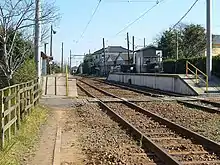 The station is also the location for a power substation with a 300 kW silicon rectifier which supplies 600 V DC to the line's overhead wires.[3] A loop and siding for freight services originally existed behind the up platform, but the loop was later removed, leaving just the siding.[2] Withdrawn EMU car DeHa 101 was previously dumped in this siding, but was disposed of in September 2009 to make space to store newly delivered 2000 series set 2002 awaiting modifications at Nakanochō depot.[4]