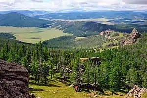 The Khan-Khukhii National Park is a separate territory from that of Khyargas Nuur National Park, which is 20 km to the south. The highest point in the park is Altan Duulga, at 2,928 metres (9,606 ft).[4] The mountain tops tend to be flat, and the slopes steep. The landscape was partially formed by glaciation.[5]