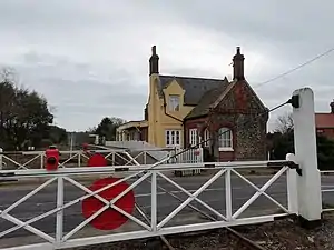 The original standard GER signal box was located at the southern end of the down platform, where the footings can still be clearly seen.[4] The Mid-Norfolk Railway published an intention to replace this 'box, in an alternate location on the currently out-of-use up platform, with the cabin from Soham.[9][10]