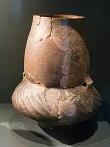 Hrala describes the Modřany cemetery as a classic site for studying the origins of the Knovíz culture.[20] The site contains distinctive pottery, including footed bowls and amphorae with handles at the base of the body. Additionally, novel forms are found, including jugs with a more balanced height-to-width ratio and an S-shaped curved shape, and bi-conical vessels which have no precursors in this location. The pottery types are distinct from those of the Lusatian culture.[21]