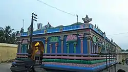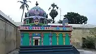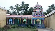 Kola Valvill Ramar Temple is located in Tiruvelliyangudi, a village located 19 km (12 mi) away from the Kumbakonam on the Kumbakonam - Chennai highway. The temple has a three-tiered rajagopuram (gateway tower) and is enclosed within brick walls. Leaving the central shrine of the presiding deity, which is built with granite, all the other shrines are built with brick.[6] There are separate shrines for the consort of Kolavalli Ramar, Maragathavalli.[7] The presiding deity, Kola Valvill Ramar, is sported in Bhujanga sayan (reclined) posture. The vimana (roof over the sanctum) has Varthaga vimana pattern. There are four water bodies namely, Sukra, Brahma, Indra and Parasara that are associated with the temple.[8]