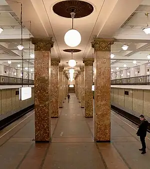 Komsomolskaya (Russian: Комсомо́льская) is a Moscow Metro station in the Krasnoselsky District, Central Administrative Okrug, Moscow. It is on the Sokolnicheskaya line, between Krasnye Vorota and Krasnoselskaya stations. It is located under Komsomolskaya Square, between the Leningradsky, Yaroslavsky, and Kazansky railway terminals. The station was named for the workers of the Komsomol youth league who helped to construct the first Metro line. It has a transfer at its namesake on the Koltsevaya line.