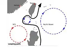 A northward flowing WBC (like the Kuroshio Current) can deform at a gap in a western boundary and form an anticyclonic current loop if the gap is wide enough.[5] This results in a looping path, where water from the Kuroshio flows through the middle of the Luzon Strait into the SCS and out in the north of the strait. The current loop in the SCS forms due to Ekman transport resulting from northeasterly winds that push Kuroshio surface water westward.[6] Anticyclonic eddies can shed from the current loop and penetrate farther into the SCS, as has been observed by Li (1997) [7]