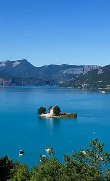 Within the lake is a small chapel, Chapelle Saint-Michel, which was originally built on a hill in the 12th century, destroyed by the army of Victor Amadeus II, Duke of Savoy in 1692, and rebuilt soon after. The chapel was originally condemned during the construction of the dam and lake, but survived, its hill becoming an island in the lake.[2] The island is accessible on foot during winter and early spring as the lake is emptier at this period
