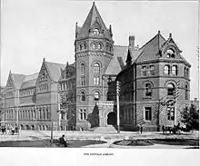 A Cyrus Eidlitz Buffalo Public Library building was first erected on the Court House's location and dedicated on February 7, 1887.[25] The current Buffalo & Erie County Public Library building that replaced Eidlitz's building was constructed between 1961 and 1963.[13] Eidlitz had won an architectural competition against the likes of Henry Richardson, who was regarded as the nation's top architect at the time.[25] The gargoyles of the Romanesque Eidlitz building were widely respected and admired. However, they were not saved due to prohibitive expense at the time of the early 1960s demolition.[25]