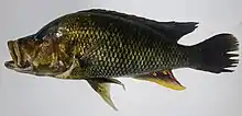 The top sportfish caught in the rivers here is a large, green fish locally known as mpifu (or ntifu?), this is a type of yellowfish only found regionally.[3][7] In 2011 this was first identified as a species similar to Labeobarbus trachypterus,[8] it may be L. stappersi.[10] It is found in forested, rocky areas in the fast-flowing main channel and rapids of the Lukulu river.[8] Other sportfish are breams such as a large nembwe-like Serranochromis (locally known as nsuku?) and redbreast kurper (Tilapia rendalli), which are found in the same river habitat as the above yellowfish, and thinface largemouth (Serranochromis angusticeps) which is found in woodland streams.[3][8][10] Other breams found in these streams are S. thumbergi, vlei kurper or banded bream (Tilapia sparrmanii),[8] and three spot bream (Oreochromis andersonii).[3]