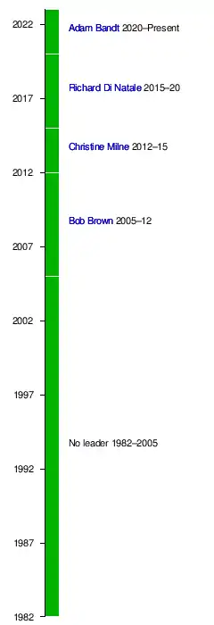Most of the Green parties which have joined the Australian Greens do not have a formal leader, and instead they have a shared leadership structure.[2] However, Tasmania, Victoria, and the ACT, have adopted singular leadership structures into their party.[2]