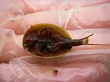 Reproduction occurs when temporary pools fill with water. Larger females have higher fecundity, the clutch size ranging from eight to 61 eggs. The eggs can withstand a period of desiccation when the pool is dry; they will then hatch within three weeks of the pool refilling, often much more quickly. Desiccation is not required for hatching, however. The larva hatches as a metanauplius. It undergoes ecdysis, or molting, several times, growing more phyllopods each time. L. packardi takes about 38 days to mature, reproduces around its 54th day of life, and lives about 144 days.[6] It is sexually mature when it is 10–12 mm (0.4–0.5 in) in carapace length. Fecundity is much reduced in individuals which are infested with a parasitic echinostome fluke.[9]