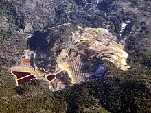 Pre-open pit mining began in 1863 by Comstock Lode miners. Between 1863 and 1870, 500 tons of copper sulfate was removed from two adits. This copper sulfate was used for silver ore refining. A large sulfur deposit was discovered in one of the adits and the mine was subsequently abandoned.[4] Between 1935 and 1941 Calpine Corporation of Los Angeles, which subleased the mine from the Texas Gulf Sulfur Company, conducted subsurface sulfur mining and recovered 5,000 tons of sulfur. Mining was suspended in 1941 due to the hazardous nature of mining sulfur underground.[5] In 1945 the Siskon Mining Corporation, acquired the mine.[6][7]