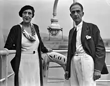 Pougy's lesbian affair with writer Natalie Clifford Barney is recorded in Pougy's novel Idylle Saphique, published in 1901 (later published in Spain in translation by the poet Luis Antonio de Villena). In 1899, after seeing Pougy at a dance hall in Paris, Barney presented herself at her residence in a page costume and announced that she was a "page of love" sent by Sappho. Although Pougy was one of the most famous women in France at the time, constantly sought after by wealthy and titled men, Barney's audacity charmed and seduced her. Of their liaison, Pougy notes: "That was in the days of the Amazon's youth, and of my own. We were passionate, rebels against a woman's lot, voluptuous and cerebral little apostles, rather poetical, full of illusions and dreams. We loved long hair, pretty breasts, pouts, simpers, charm, grace; not boyishness."[4] Their amorous relationship lasted less than a year and their love letters reflect the passions they shared and also the conflicts.[5] The two were said to have had deep feelings for each other for the remainder of their lives, although their relationship was not without its ups and downs. In Women Lovers, Barney recounts the bittersweet romantic rivalry she shared with Pougy in a "barely disguised roman à clef" in which "Barney, the dashing Italian baroness Mimi Franchetti, and the beautiful French courtesan Liane de Pougy share erotic liaisons that break all taboos and end in devastation as one unexpectedly becomes the “third woman.”[6] For her part, Pougy depicts their relationship in My Blue Notebooks as one that grew more distant over the years, possibly ending in 1934 when the two ran into each other in Toulon, but did not exchange a word.[7]
