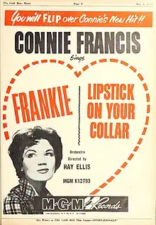 The result was the most successful double-sided hit of Francis' career, as "Lipstick on Your Collar" – the first uptempo Connie Francis single to reach the US Top Ten – peaked at No. 5 on the Billboard Hot 100 in July 1959, while "Frankie" peaked at No. 9.[7] "Lipstick on Your Collar" sold over one million copies in the US.[8]
