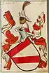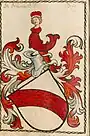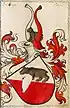 - ↑ Schild von Roth und Silber gespalten und darüber eine schwarze Zwergstrasse or Mauer mit vier Zinnen