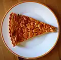 Almond cake Moist, sweet cake flavored and topped with almonds, typically featuring layers of cream in between cake layers