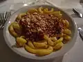 | Pasta chi Vrocculi Arriminati | ![]() | a pasta dish from Palermo which generally consists of a long pasta like spaghetti or bucatini, cauliflower, onion, raisins, anchovies, pine nuts, saffron, red chili, and breadcrumbs |