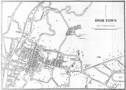Street map of Ipoh in 1921. The Kinta River and FMS railway run from the north to the SW corner. The heart of the town lies between them. Hugh Low Street is the main road running east–west, crossing the river, passing through the centre of town and leading to the railway station. As it leaves the town, it forks to the South East becoming Gopeng Road - the main road to Gopeng which was one of the first roads in the region.