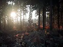 At the north-east centre of the parish is Athelstans (or Athelstan's) Wood, rectilinear of 1,200 yards (1,000 m) by 800 yards (700 m) and extending to all but 100 yards (90 m) across the parish. The wood is conjoined at north to Rough Hill Wood in Aconbury parish.[9][10][11][12] Athelstans Wood, named after Athelstan, Bishop of Hereford (died 1056), became a royal wood along with Aconbury Wood and Harewood. Aconbury Priory was established by King John, who gave priory nuns felling and selling rights to Athelstans Wood. Following the Dissolution of the Monasteries in the 16th century, the woods became the property of the Scudamore family, who until at least the 18th century coppiced the wood to make charcoal for fueling forges, while oak bark was used in the leather tanning process. The extent and characteristics of the wood remained the same from this time until after the Second World War, witnessed by aerial photographic evidence of 1946. Before felling from the 1950s, making room for the wide commercial coniferisation of the 1970s approved by the Forestry Commission, the woods were of lime and ash, with "oak and sweet chestnut trees and the sheets of bluebells and wood anemones under the coppice".[24]