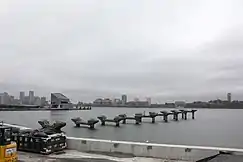 By October 2019, much of the park's perimeter had been installed.[58] That month, the project was renamed Little Island.[5][59][60] The first trees at Little Island were installed in March 2020.[15][61][62] According to photos taken the next month, all the piles and pots had been installed, and the layers of soil supporting the vegetation were being planted.[61] Despite the onset of the COVID-19 pandemic in New York City during 2020, the park's construction was allowed to proceed even as most other projects were forced to stop. Work was temporarily halted for three weeks to disinfect the worksite, but the park was otherwise classified as an "essential project". Since most of the work was conducted outdoors, Little Island's construction site was considered a less likely place for COVID-19 to spread compared to indoor projects.[10] The park's construction was nearly completed by early 2021.[63]