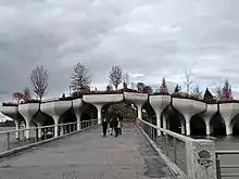 Arup Group oversaw the structural design of the park.[7][8] Little Island is supported by 132 pot-shaped structures suspended above the water.[7][9] These "tulip pots" vary in height and are between 15 and 62 ft (4.6 and 18.9 m) above the mean waterline.[7] This was meant to protect the park from a 500-year flood, in which the water level in the river rises as much as 11 ft (3.4 m).[10] The heights of the pots were intended to give the appearance of a floating leaf[2] or a wave.[10] Numerous other firms were involved in the structural design, including precast cement contractor Fort Miller Company, marine consultant Mueser Rutledge Consulting Engineers, and marine contractor Weeks Marine.[10]