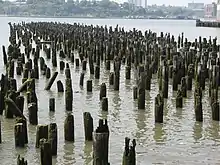 Each pot has four to six lightweight concrete sections, referred to as "petals", which are designed to reduce the load on the pilings.[9][10] The precast concrete is also meant to be resistant to erosion and corrosion.[10] The concrete pots were manufactured by the Fort Miller Company at their factory in Easton in Upstate New York.[9][11] The Fort Miller Company hired a partner to create foam molds for the pieces of the pots using a laser cutter, then cleared out a 600-foot-long building for these foam pieces. Thirty-nine types of molds were fabricated. According to the company's president, "A full one-third of our annual production capacity was displaced by this project."[10]