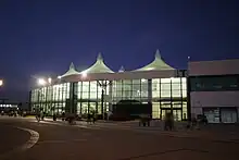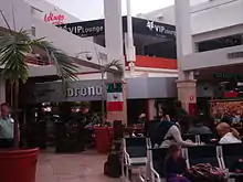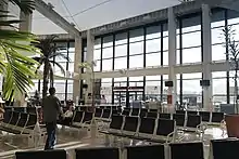 The airport operates two terminals. Terminal 1, covering an area of 16,580 square metres (178,500 sq ft), manages arrival and departure facilities for domestic flights within a single-story building. It features a distinctive roof over the departures concourse with peaked white structures. The arrivals area includes a baggage claim area, car rental services, taxi stands, snack bars, and souvenir shops. The departures section includes a check-in area, a security checkpoint, and a concourse with a food court and 8 gates on the ground level, allowing passengers to walk to their aircraft. From this departure concourse, access to a mezzanine is available, which houses a VIP lounge.[6]