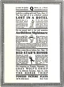![]() Powers' promotion of the film as the lead short on a split reel, September 1911 | |