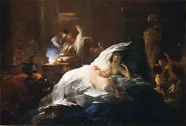 From 1684 to 1686, Cretey created a series of paintings for the refectory of the Benedictine abbey of Saint-Pierre, including The Last Supper, The Multiplication of the Loaves, The Assumption of the Virgin, The Ascension of Christ and an The prophet Elias. These refectory paintings (now in the Musée des beaux-arts de Lyon) show groups of figures vividly lit in front of dark backgrounds, recalling not only 16th-century Venetian pre-baroque prototypes but also Simon Vouet's early Italian works and their chiaroscuro.[2]