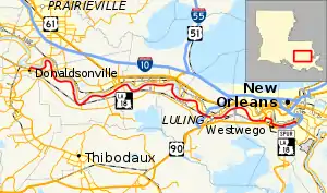 Louisiana Highway 18 (LA 18) is a state highway that serves Ascension, St. James, St. John the Baptist, St. Charles, and Jefferson Parishes. Called the Great River Road, it runs from west to east, parallel to the west bank of the Mississippi River, running from Donaldsonville to Gretna. It spans a total of 79.7 miles (128.3 km).[1] In the more rural parts of LA 18's span, it is commonly referred to as River Road, but it becomes 4th Street once it enters Westwego.