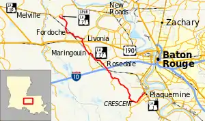 Louisiana Spur Highway 77 (Spur LA 77) is a 1.4-mile-long (2.3 km) highway that covers a glitch in the state highway system. The current LA 77 follows the routing of the original Jefferson Highway, and the LA 77 alignment follows the old road to meet LA 10 West. However, this shortcut is used to reach Morganza, to the northeast of Livonia.[2]