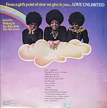 From a Girl's Point of View We Give to You... Love Unlimited is the debut studio album of American soul vocal trio Love Unlimited, released in 1972 on Uni/MCA Records. Produced by soul recording artist Barry White, for whom the trio served as a backing group at the time, the album was arranged by White and conductor Gene Page. It was digitally remastered by recording engineer Bill Inglot and reissued on May 10, 1994 by Varèse Vintage.[2]