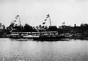 As well as servicing Queensland lighthouses, the steamer was used for ministerial visits along the coast (and to New Guinea on occasion), cabinet meetings on the Brisbane River and Moreton Bay, picnic outings for various associations and annual excursions for school children in the state. Lucinda was also flagship of the Royal Queensland Yacht Squadron, and she was referred to as Queensland Government Steam Yacht (QGSY) Lucinda.[2][6] Lucinda was used at one time as a mail vessel for delivering mail along the Queensland coast. At that time she was largely captained by Captain James Hodda South (serving with distinction from 17 November 1887 until his retirement with the rank of Commander on 1 May 1907) who notably surveyed/sounded and used South Passage in Moreton Bay to cut hours off the mail route. It was thought by some that this is how South Passage came to be named; however, the name had been given to this Southern Passage about 50 years earlier.[2]