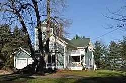 Lynnwood is a historic house at 5 Linden Avenue in Wakefield, Massachusetts. Built c. 1858, it is one of the town's finest examples of Stick style architecture. It is a 1+12-story wood-frame structure with an L-shaped cross-gable configuration; its features include deep eaves supported by arched brackets, and a 3+12-story tower topped by a hip roof with triangular dormer windows. Its eaves have brackets with pendants, and its windows have surrounds with drip molding.[2]