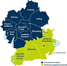 The MVV coordinates transport and fares in area comprising the city of Munich and eight surrounding districts. It is jointly owned by the state of Bavaria, the city of Munich and the eight surrounding districts, which are:[2]