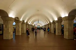 Maidan Nezalezhnosti (Ukrainian: Майдан Незалежності, ⓘ) is a station on Kyiv Metro's Obolonsko–Teremkivska line. The station was opened on 17 December 1976, and is named after Kyiv's Maidan Nezalezhnosti (Independence Square) on the Khreschatyk street. It was designed by N. Kolomiiets, I. Maslenkov, M. Syrkyn, and F. Zaremba.