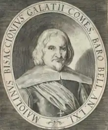 Maiolino was born in Ferrara, the son of Giralamo Bisaccioni and Lucia Trotti, who were both from prominent families in Jesi. He initially studied at the University of Bologna, and obtained a doctorate in law. However he instead began a career mainly as a condottiere, that is, a mercenary captain for hire. His first campaign was fighting for the Venetian Republic under the Count di Fuentes, Governor of Milan. While stationed at the fortress of Orzinuovi near Brescia, he dueled with a veteran captain of the name of Domenico Cresti. In 1601 he was at the siege by Catholic forces of Canisca, a town at the Hungarian border. In 1603, he was back in Italy where he engaged in another duel with Alessandro Gonzaga, his commander, and this led to his expulsion from the Papal States. He moved to the Duchy of Modena, where in the year 1610, he was appointed Podesta at Baiso. He was briefly jailed for another scuffle, this time the shooting at a Dominican friar. While in Modena he wrote a fierce criticism of Fulvio Testi. Released and promoted in the military of the duchy, he again dueled this time with the Prince of Correggio, forcing him now into exile and fighting for the Prince of Moldavia. He fought in the defense of Vienna with the Count Bucquoy. He later rejoined the diplomatic efforts of the Papal States, traveling widely. While living in Naples, he was elected a member of the Literary Accademia degli Oziosi, and in Rome to the Accademia degli Incogniti.[1] Bisaccioni is mainly known as an historian. He wrote histories of the Thirty Years' War (1633–7), recent civil wars (1652), and the Neapolitan Republic (1660). His most important novel, Il Demetrio moscovita (1639), recounts False Dmitry I's rise to power and tragic death. Bisaccioni was the foremost Italian translator of French novels of the 17th century. He translated several French contemporary novels by Madeleine de Scudéry, Jean Desmarets, and Gauthier de Costes, seigneur de la Calprenède. Between 1637 and 1664 he published four collections of short stories: La nave, L'albergo, L'isola, and Il porto.