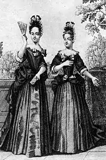 so that nothing in this spectacle might be disagreeable to this Prince, she had Persian clothes made for all the Demoiselles who were to appear on the stage : they were very brilliant, ornamented with pearls and diamonds from the Temple, which had previously been used in the ballets.[14]