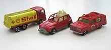 The popular 300 series combinations of cars with trailers and boats as well as semi-articulated trucks dated from the mid-1970s.[2][5] One clever example was the handsome Volkswagen beetle towing kayaks on a trailer, the Renault Michelin canvas topped tractor trailer in blue and yellow from the 1980s, or the Chevy pickup truck hauling a luxurious yacht.[5][6] Buses like the traditional London double decker were also produced in the 300 series in the mid-1980s. These were promotionals advertising the new bus service, but although the labeling was true-to-life, the toy Majorettes decorated bore little resemblance to the real London buses.[7]