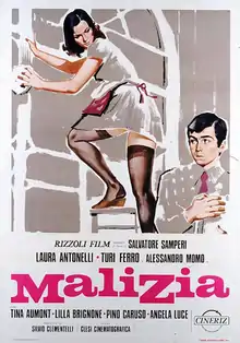 Malicious (Italian: Malizia, lit. 'Malice') is a 1973 Italian erotic comedy-drama film co-written and directed by Salvatore Samperi. It stars Laura Antonelli, Turi Ferro and Alessandro Momo. The film is about the sexual desire of a widower and his three sons for their new housekeeper.[2] At the Silver Ribbons awards, Antonelli and Ferro won Best Actress and Best Supporting Actor, respectively.[3] The film was entered into the 23rd Berlin International Film Festival.[4] A sequel, Malizia 2000, was released in 1991 with the same cast.