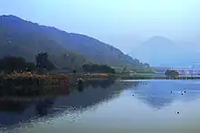 The hills surrounding the lake area, towards the north east of Jaipur, have quartzite rock formations (with a thin layer of soil cover), which is part of Aravalli hills range. Rock exposures on the surface in some parts of the project area have also been utilised for constructing buildings. From the north east, the Kanak Vrindavan valley, where a temple complex is situated, the hills slope gently towards the lake edge. Within the lake area, the ground area is made up of a thick mantle of soil, blown sand and alluvium. Forest denudation, particularly in the hilly areas, has caused soil erosion, compounded by wind and water action. Due to this, silt built up in the lake resulting in a raising of the bed level of the lake.[5] The flora is dictated by the subsidiary Edaphic type of dry tropical forests in the catchment; the total forest area of 9.01 square kilometres (3.48 sq mi) comprises dense forest cover of 6.45 square kilometres (2.49 sq mi) area, degraded forest of 0.95 square kilometres (0.37 sq mi) and encroachment of 1.61 square kilometres (0.62 sq mi). The dominant floral species found in the area is Dhauk (Anogeissus pendula), which has lean foliage. The low vegetation cover and steep gradient of the hills causes substantial erosion and the eroded material flows into the lake. On the western side, beyond the urbanised area, the Nahargarh hills on the western side are also denuded, which has reduced its moisture retaining capacity.[5]