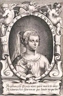 Marie de Gournay (French pronunciation: [maʁi ɡuʁnɛ] ; 6 October 1565, Paris 13 July 1645) was a French writer, who wrote a novel and a number of other literary compositions, including The Equality of Men and Women (Égalité des hommes et des femmes, 1622)[1] and The Ladies' Grievance (Grief des dames, 1626).[2] She insisted that women should be educated. Gournay was also an editor and commentator of Michel de Montaigne. After Montaigne's death, Gournay edited and published his Essays.