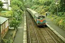 A NIR 101 Class diesel locomotive hauls a passenger train into Marino station in 1983