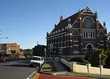 Adjacent to the school are a number of Catholic buildings still owned by the Parish. At 369 Given Terrace stands the large red brick Sacred Heart Church, built in 1917. Immediately across the road at 333 Given Terrace is the "Sacred Heart Primary School" (consisting of 5 small buildings) for grades 1–7, now closed but used by other Catholic groups. Behind that is a brick community hall constructed in 1978. There is also a parish priest residence on Given Terrace and a smaller building on the corner of Fernberg Road and Given Terrace that stands where the parish’s original wooden church stood. The original wooden church was constructed and formally blessed by Archbishop Robert Dunne on 10 March 1907 and was used until the large brick church was built in 1917, and thereafter it was used for primary school schooling until it burnt down in the 1970s. Finally at 327 Given Terrace there is the Sacred Heart Convent built in 1918 which was owned and used by the Sisters of Mercy order of nuns (who had commenced teaching in the parish in 1905) until sold by them in 2005. All of these premises have been utilised by the Marist Brothers High School when the need arises.