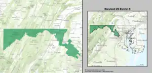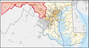 Maryland's 6th congressional district elects a representative to the United States House of Representatives from the northwest part of the state. The district comprises all of Garrett, Allegany, Frederick, and Washington counties as well as a portion of Montgomery County. David Trone (D) is its current representative.[3]